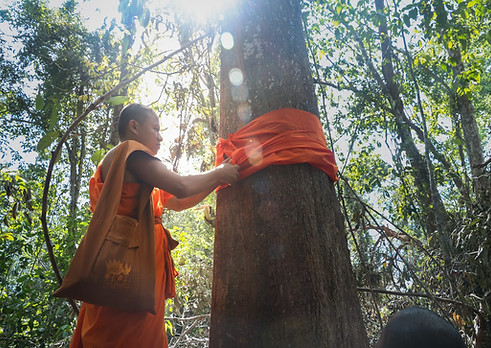 Tree ordination is a practice that originated in Thailand and spread to the Buddhist countries of Cambodia, Vietnam and Sri Lanka. It is a ritual performed by monks, often with community members, as a way to both sanctify and protect the forest. Those who encounter these trees, wrapped in monks’ saffron robes, know the area is sacred, and that if the trees and wildlife are harmed there, they will reap terrible karmic retribution. The revered Cambodian monk, Maha Ghosananda, famously ordained a tree in Ratanakiri province to highlight deforestation. He stated: ‘When we ordained a tree, it became a monk… and we told the people. When you kill the tree, then you kill the monk.'